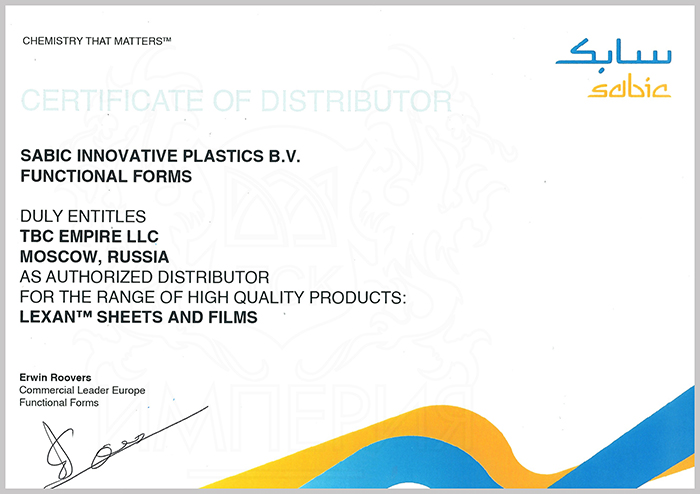 Мы являемся сертифицированными дилерами: Sabic (ТМ LEXAN, Нидерланды-Австрия), Юг-Ойл-Пласт (ТМ Borrex, Россия), Дестек (ТМ PLEXIGLAS, Оргстекло, Россия), CLAX Italia (Блочное оргстекло, Италия), Madreperla (Оргстекло, Италия), Palram (ТМ PALGLAS, Израиль), Dott. Gallina (ТМ GALLINA, Италия) . Эти компании – признанные инноваторы в сфере производства полимерных материалов. Мы имеем возможность поставлять на рынок России качественные поликарбонат и оргстекло от производителей с мировым именем.