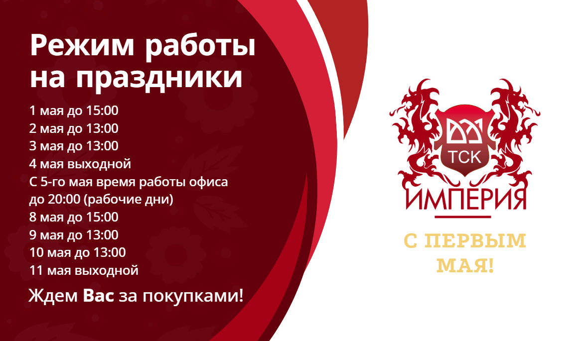 Поздравляем вас с наступающими майскими праздниками и обращаем ваше внимание на график работы нашей компании в праздничные дни:
