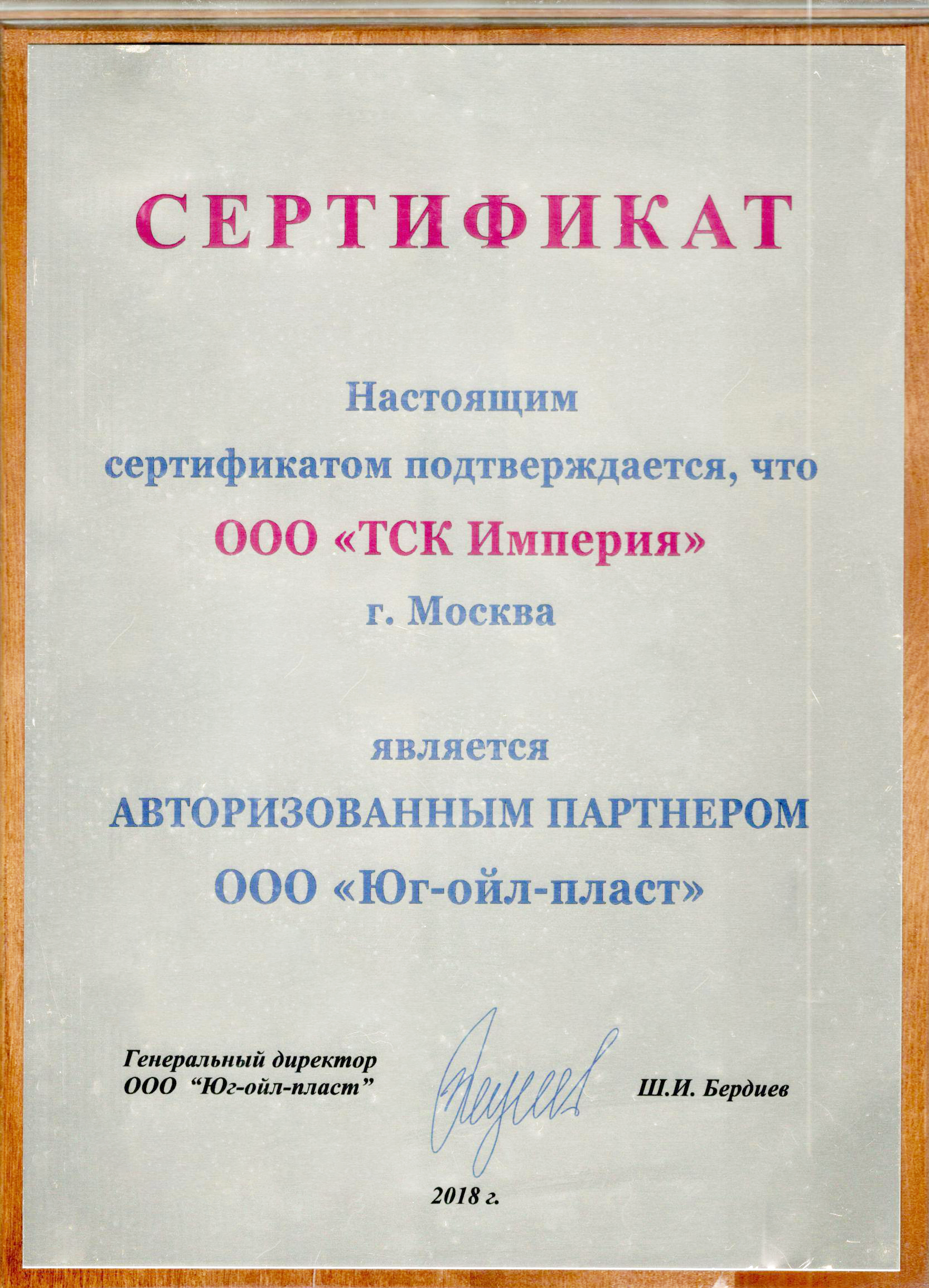 - Сертификат официального дилера компании Юг-Ойл-Пласт.