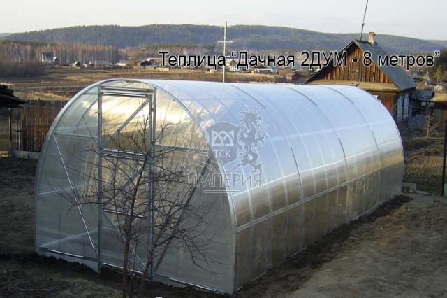 Площадь укрываемого грунта зависит от длины. Теплица "Дачная Трёшка" имеет два дверных проёма в противоположных торцах и в каждом дверном проеме имеет дверь и форточку. Покрытие на зиму снимать не нужно. Каркас теплицы изготовлен из оцинкованного профилированного железа толщиной 0,8мм. К теплице поставляется в комплекте специальный уплотнитель. Теплица может иметь различную длину. В комплект входят трапецевидные усилители.