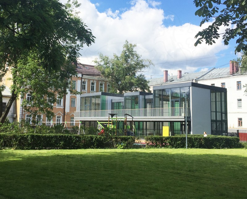 Фасады: поликарбонатные фасадные панели, толщина 40 мм, текстура/цвет: диффузер, колотый лед и зеленый.