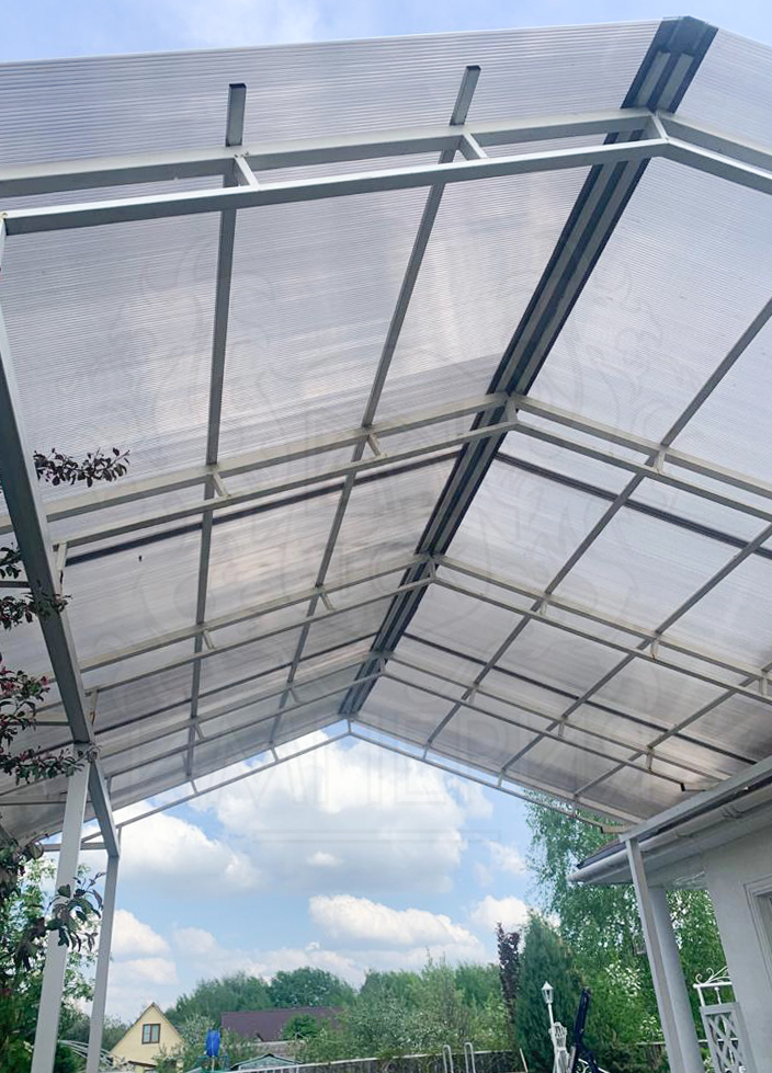 Навес выполнен из сотового поликарбоната Lexan толщиной  10 мм, цвет: бронза серая.