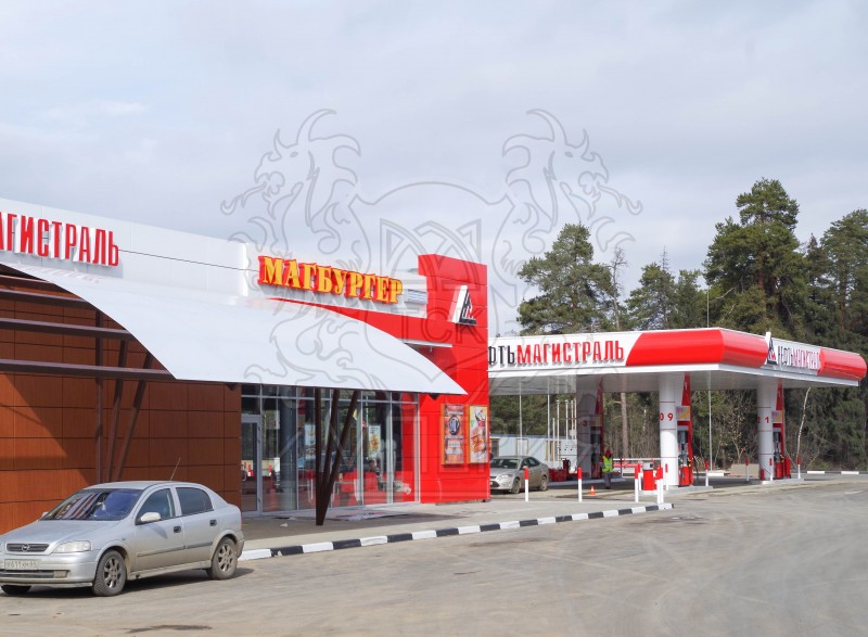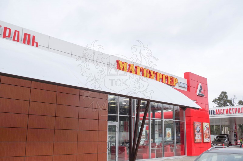 Торгово-Строительная Компания Империя осуществила расчет, комплектацию и поставку монолитного поликарбоната на навес над входом в кафе на заправке по Ярославскому шоссе, 25км от МКАД .