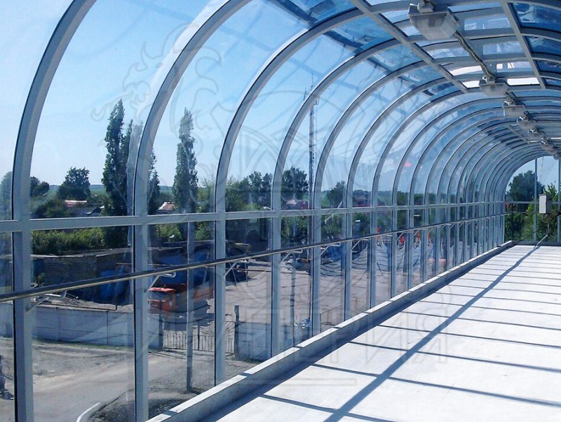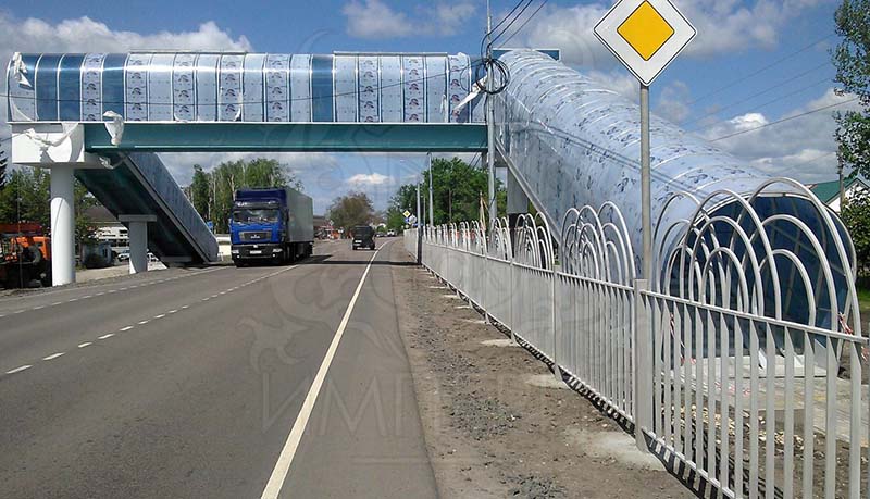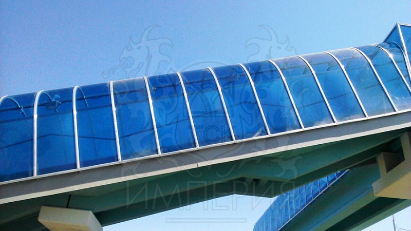 Компания ООО "ТСК Империя" осуществила расчет и поставку монолитного поликарбоната для остекления пешеходного перехода в Орловка обл. п. Беседино. Надземный пешеходный переход выполнялся из литого поликарбоната толщиной 5 мм, цвет: голубой.