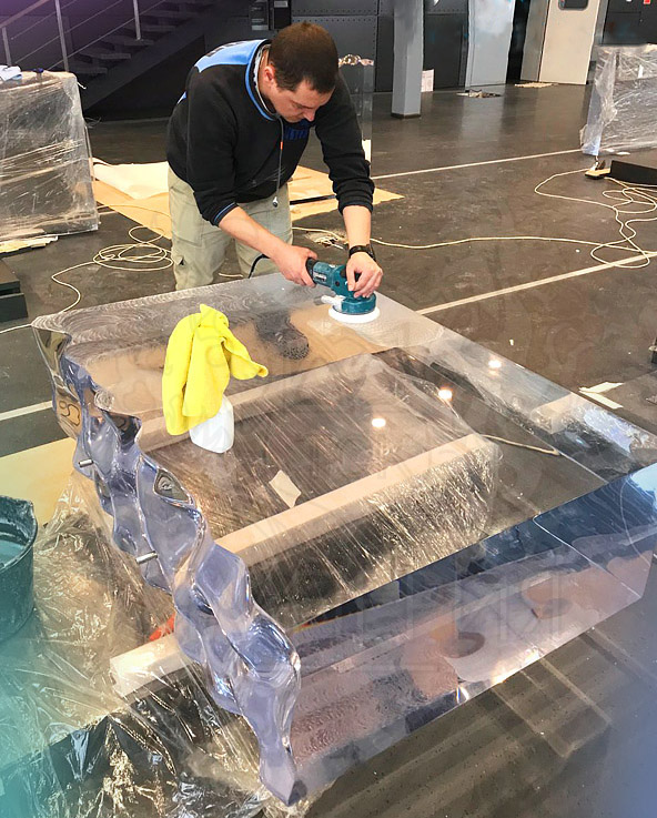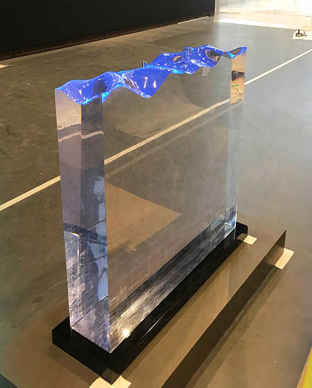 Блоки из акрила были обработаны лазерной резкой для создания волн, заказчиком специально подбирался материал создающий имитацию воды.