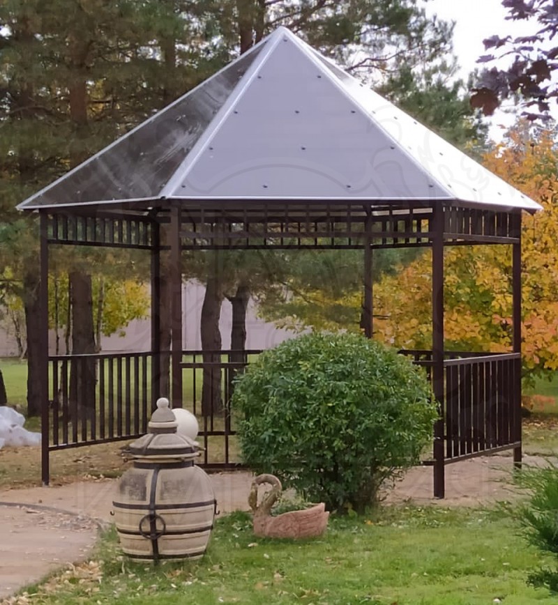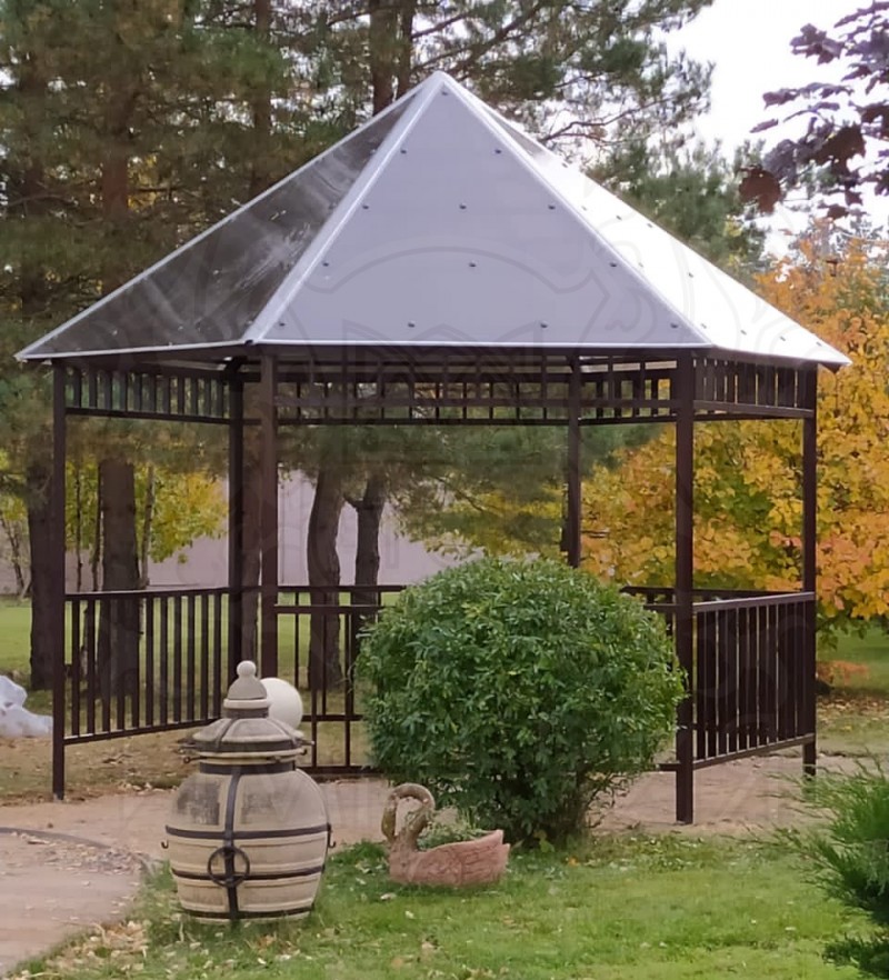 Компания "ТСК Империя" осуществила расчет, комплектацию и поставку материала для беседки. Навес выполнен из сотового поликарбоната толщиной 10 мм; цвет бронза. Объект выполнен 2020 году.