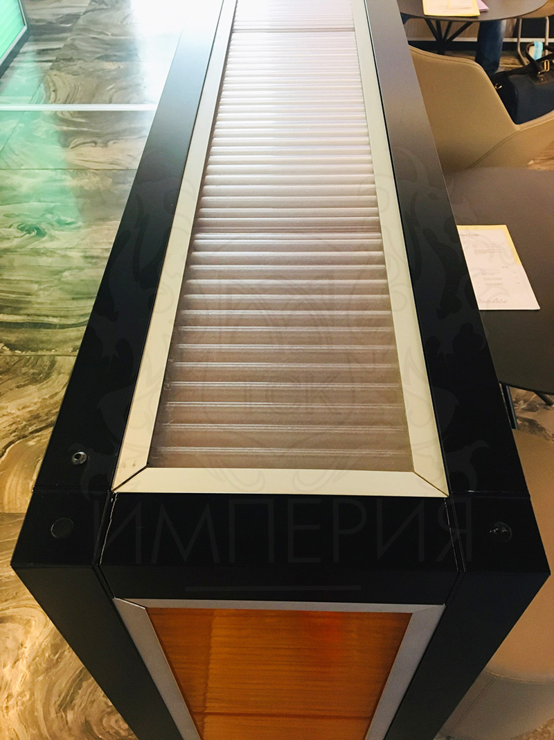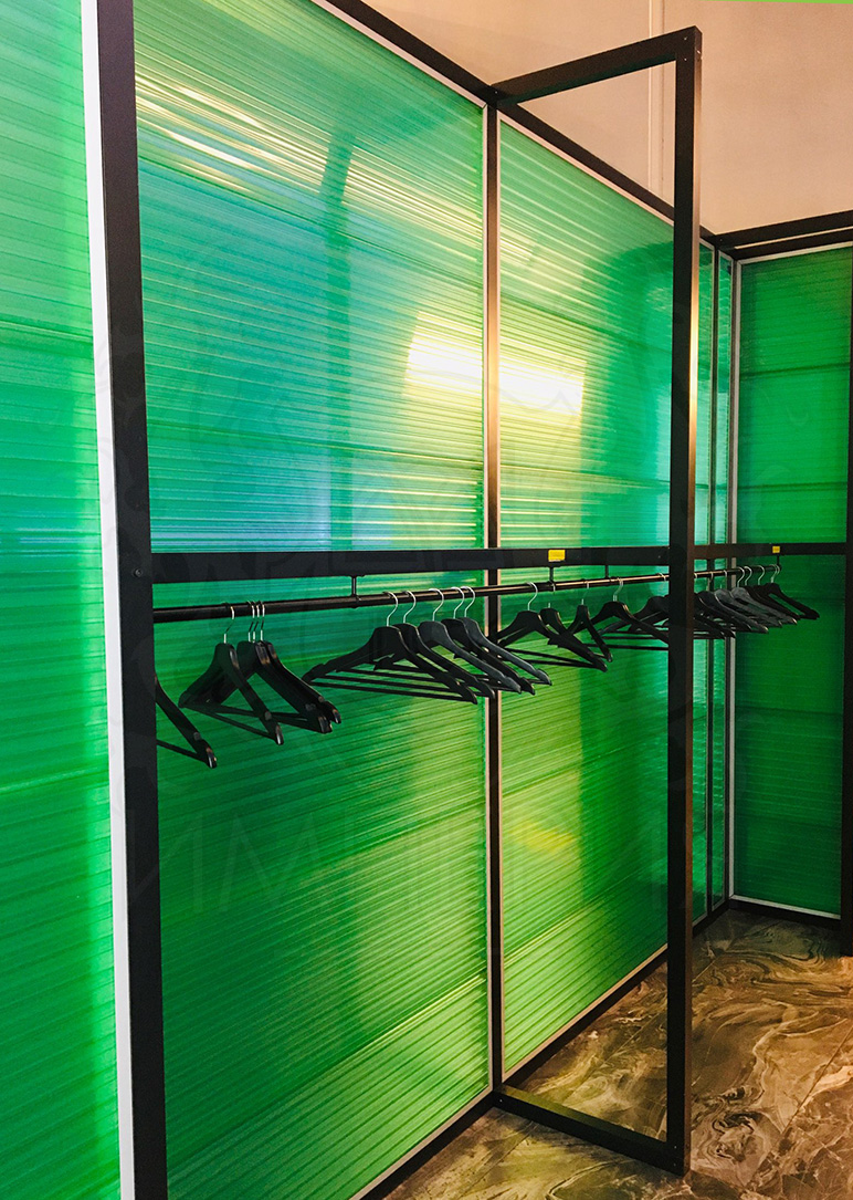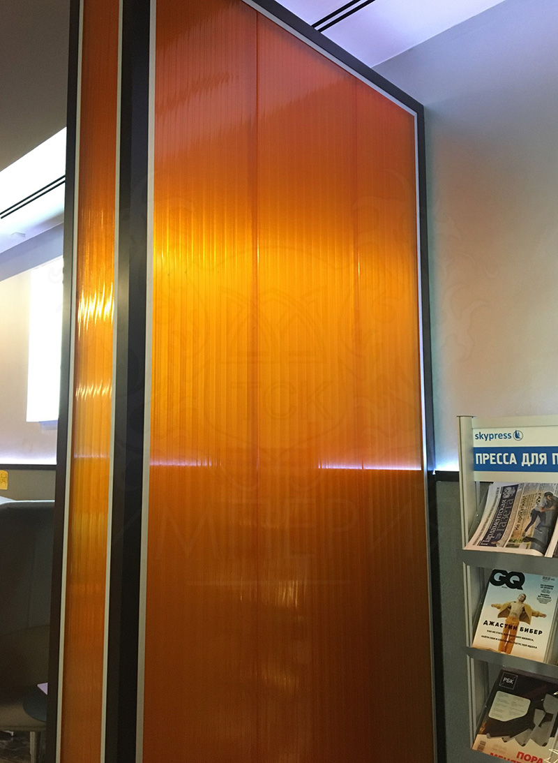 Использовались поликарбонатные фасадные панели, толщина 40 мм, текстура/цвет:  колотый лед, зеленый, оранжевый.
