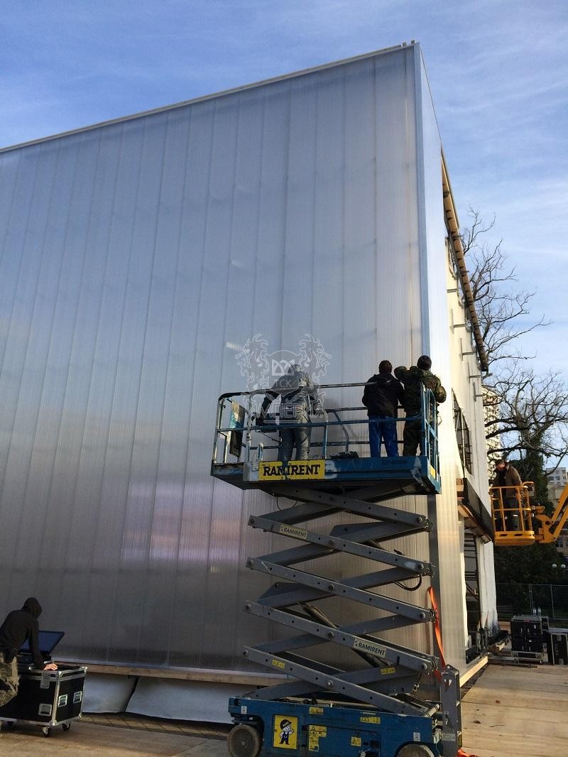 Фасад выполнен из бесцветных замковых поликарбонатных панелей Lexan Thermoclick толщиной 40мм. Панели LEXAN 40мм с совмещенной Х-образной и 4-х стеночной прямоугольной структурой, обеспечивают высокую жесткость, прочность на изгиб и на поперечный сдвиг, а также отличаются высоким сопротивлением теплопередаче, что дает дополнительное преимущество стеновым фасадным панелям - свойство отличной термоизоляции.