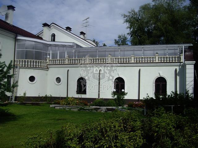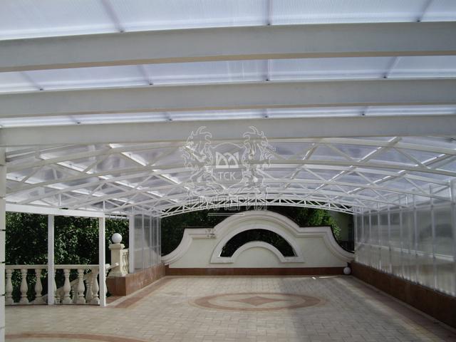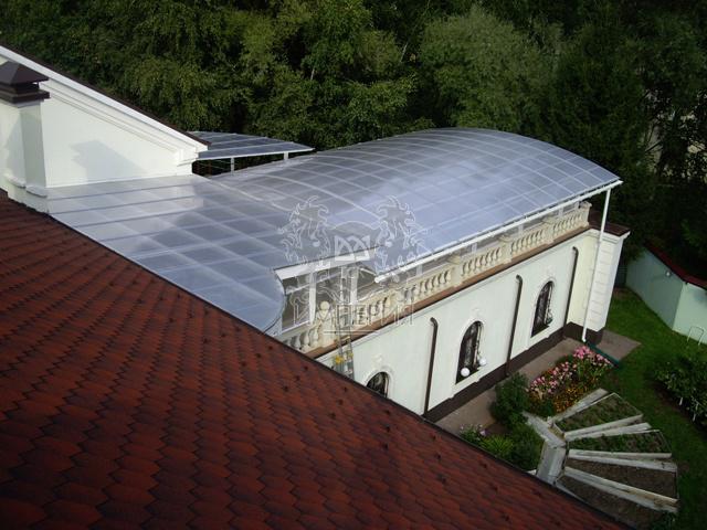 Компания "ТСК Империя" осуществила расчет, комплектацию, поставку и монтаж замковых панелей в одном из коттеджных поселков МО. Крышавыполнена из кровельной системы структурированного поликарбоната SUNPAL и интегрированным замком толщиной 20мм. Объект выполнен 2011 году.