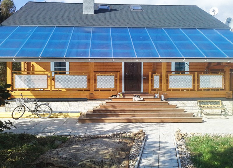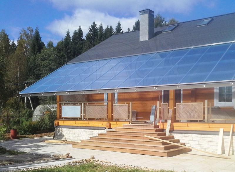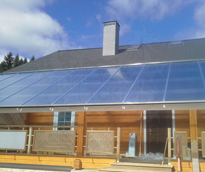 Компания "ТСК Империя" осуществила расчет, комплектацию и поставку кровельных замковых панелей Sunpal (Израиль) для остекления террасы. На кровле использовалась замковая система Sunpal из сотового поликарбоната с гарантией от протечек 25 лет толщиной 20 мм синего цвета.