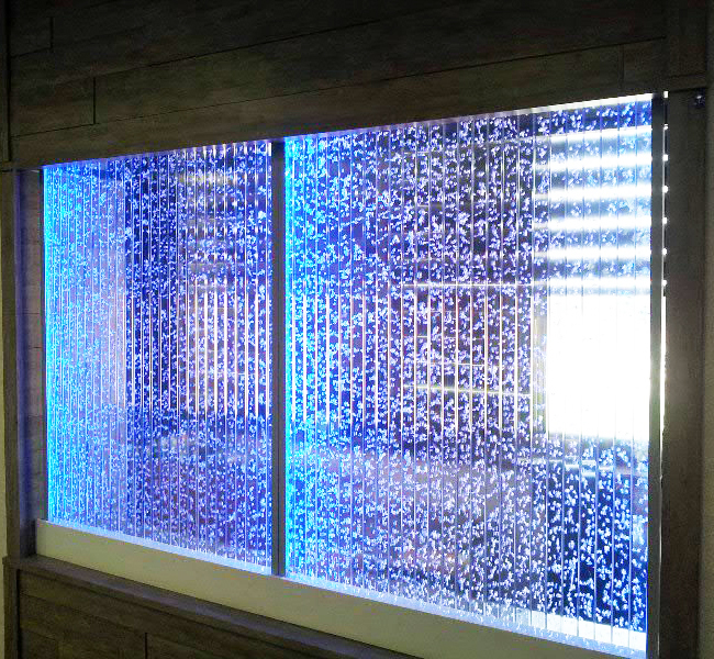 Широко применение и распространение сотовое оргстекло нашло в производстве воздушно-пузырьковых панелей, такая панель сможет украсить любой интерьер: офис, торговый центр, клубы и рестораны, при том, что все это будет дополнено красивой подсветкой. Декоративный эффект пузырьковой панели создается за счет движения огромного числа пузырьков воздуха в изолированных каналах плоской сотовой конструкции из оргстекла или единой плоской полости, ограниченной двумя прозрачными стенками. Ограниченный объем панели заставляет пузырьки причудливо менять свою траекторию, вибрируя и меняя скорость. Панели дополнительно освещены лучами света различных цветов. Огромная плоскость поднимающихся мелких пузырьков создает фантастическую картину непрерывного вертикального движения или турбулентного вращения. Так же для изготовления декора используют трубы и так же размещают в них подсветку и/или пузырьки.