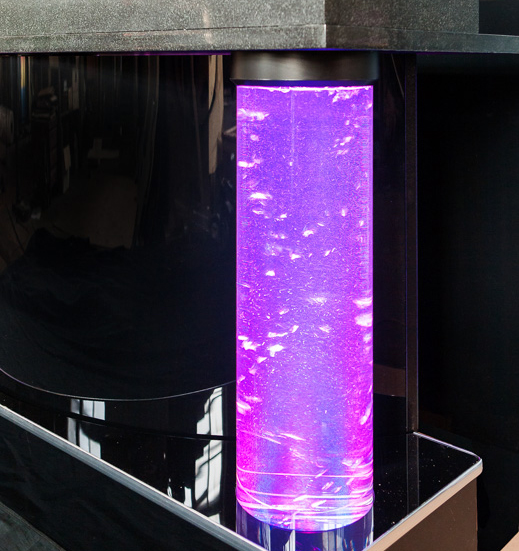 Широко применение и распространение сотовое оргстекло нашло в производстве воздушно-пузырьковых панелей, такая панель сможет украсить любой интерьер: офис, торговый центр, клубы и рестораны, при том, что все это будет дополнено красивой подсветкой. Декоративный эффект пузырьковой панели создается за счет движения огромного числа пузырьков воздуха в изолированных каналах плоской сотовой конструкции из оргстекла или единой плоской полости, ограниченной двумя прозрачными стенками. Ограниченный объем панели заставляет пузырьки причудливо менять свою траекторию, вибрируя и меняя скорость. Панели дополнительно освещены лучами света различных цветов. Огромная плоскость поднимающихся мелких пузырьков создает фантастическую картину непрерывного вертикального движения или турбулентного вращения. Так же для изготовления декора используют трубы и так же размещают в них подсветку и/или пузырьки.