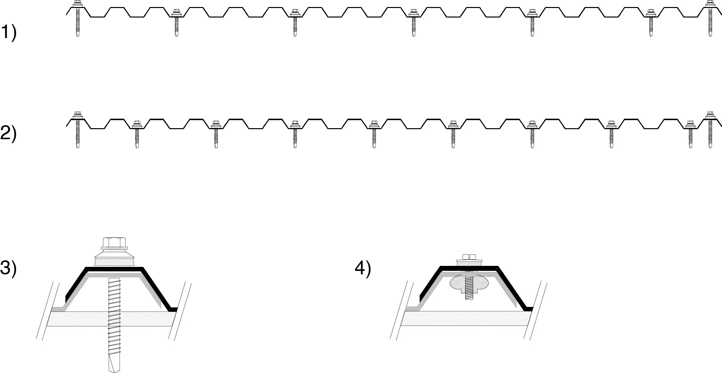 - Закрепите винты по промежуточной балке, в каждую третью волну листа (2).