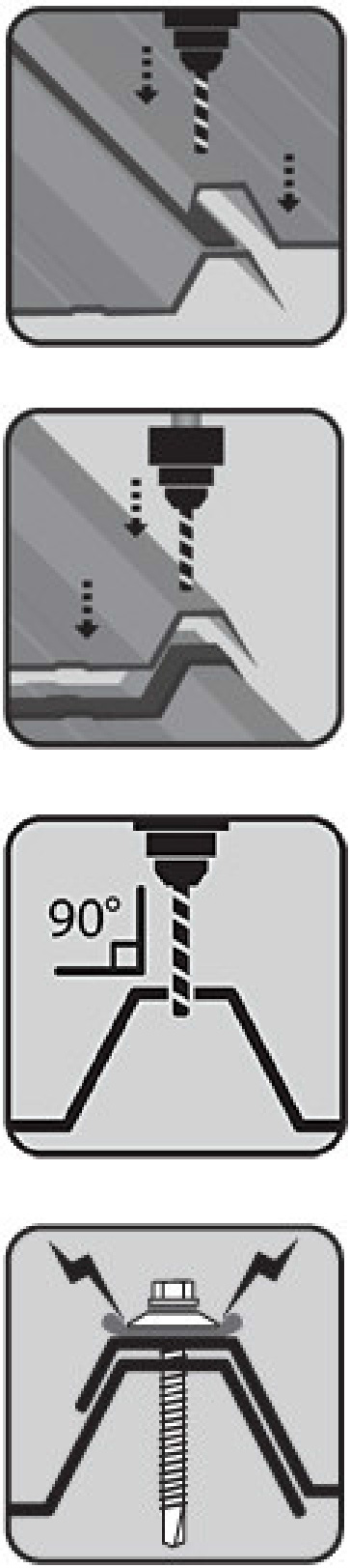 - Начните закреплять винты с первого бокового нахлеста (левая сторона) через предварительно просверленные отверстия (3).