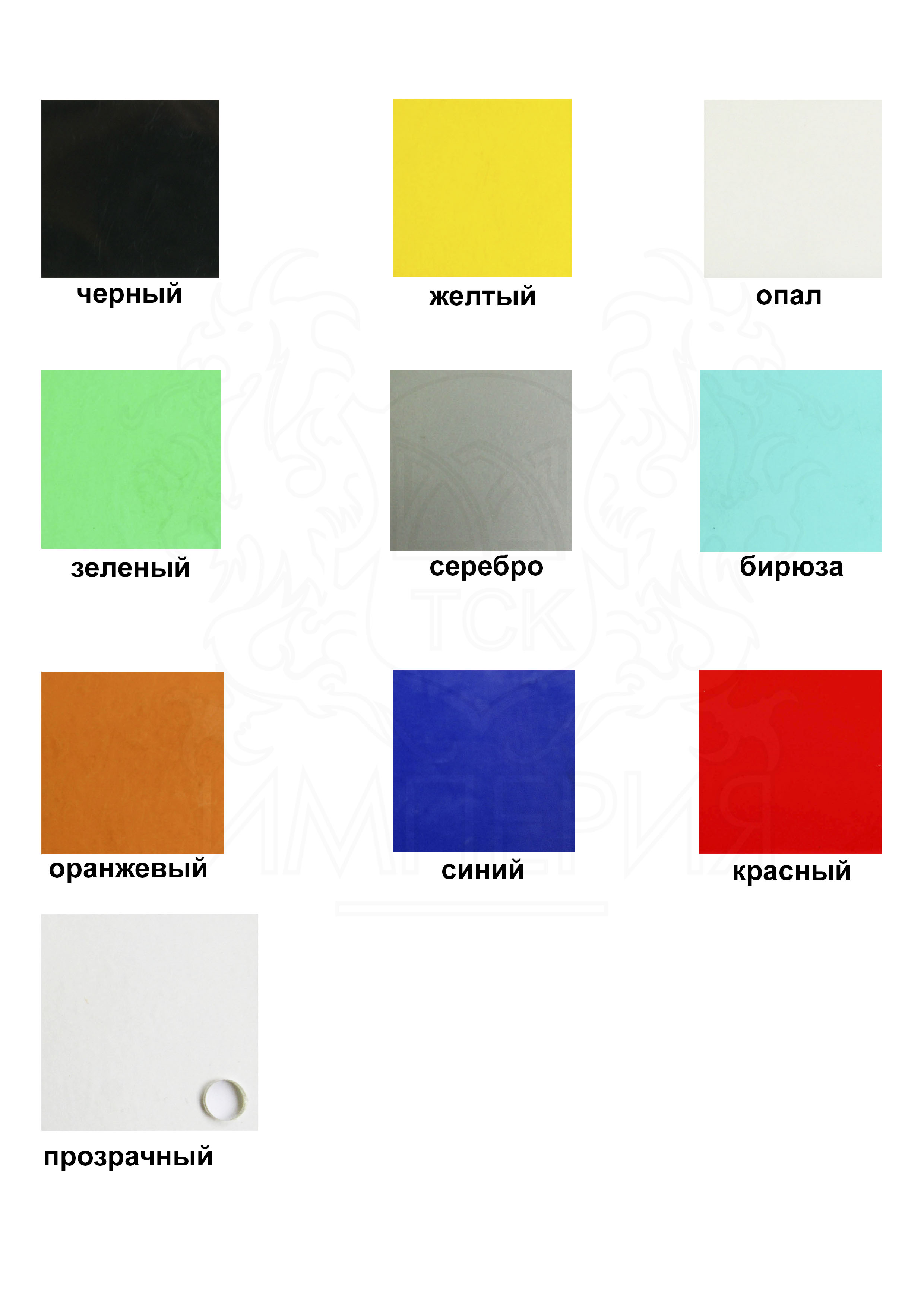 Цвета: бесцветный, молочный, бронза, зеленый, синий, бирюза, красный, желтый, оранжевый, серебристый металлик.