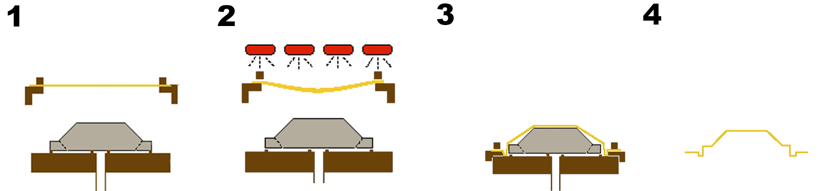 Формовка под вакуумом: Стол приподнимается, прототип прижимается к листу, и создается вакуум, под действием которого поликарбонат плотно облегает форму прототипа.